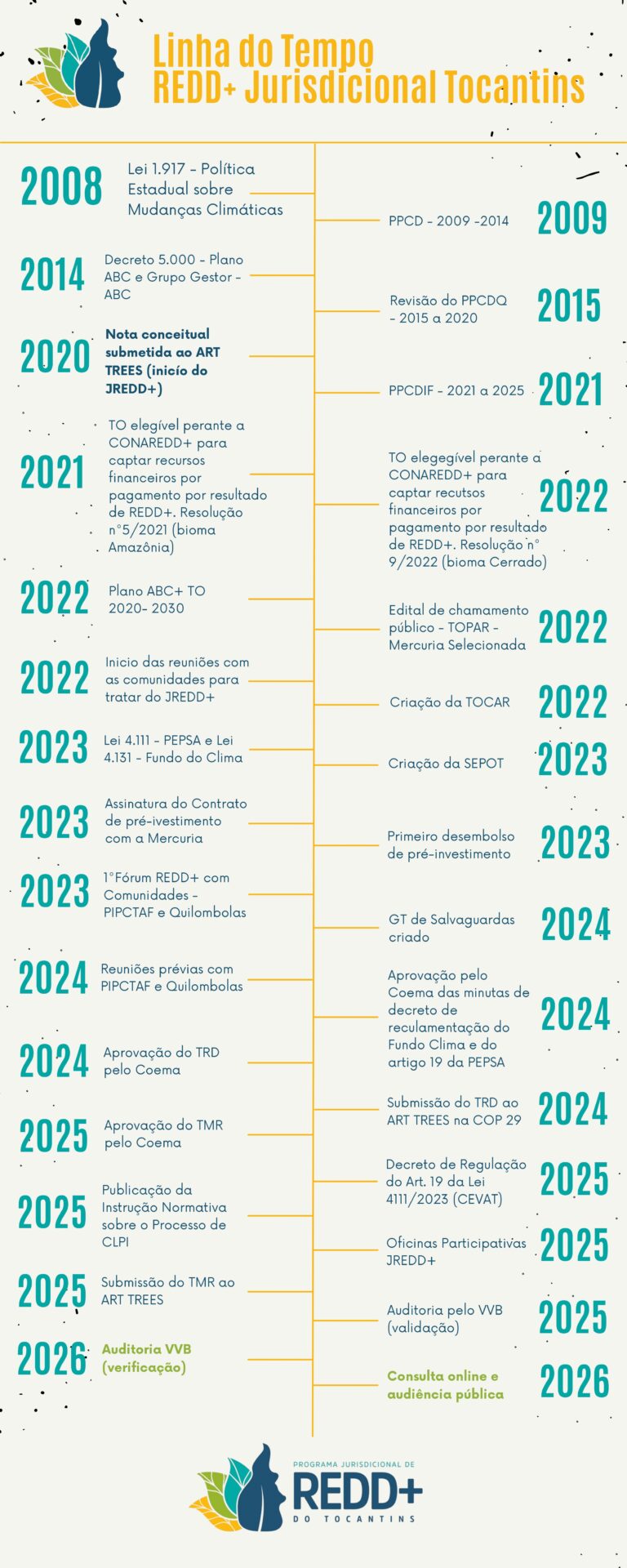 Já em 2008, o Tocantins estabeleceu a sua PEMC, que inclui entre seus objetivos a execução de iniciativas de REDD+ no nível estadual. A PEMC define que o Estado do Tocantins é o responsável por desenvolver